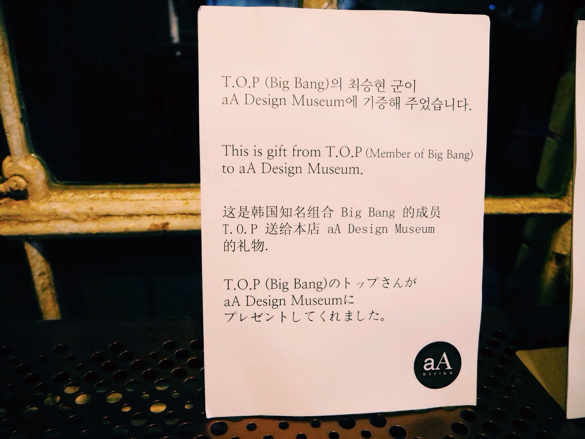 Check this out: Big Bang’s TOP contributed this vintage metal bench to aA Design Museum!