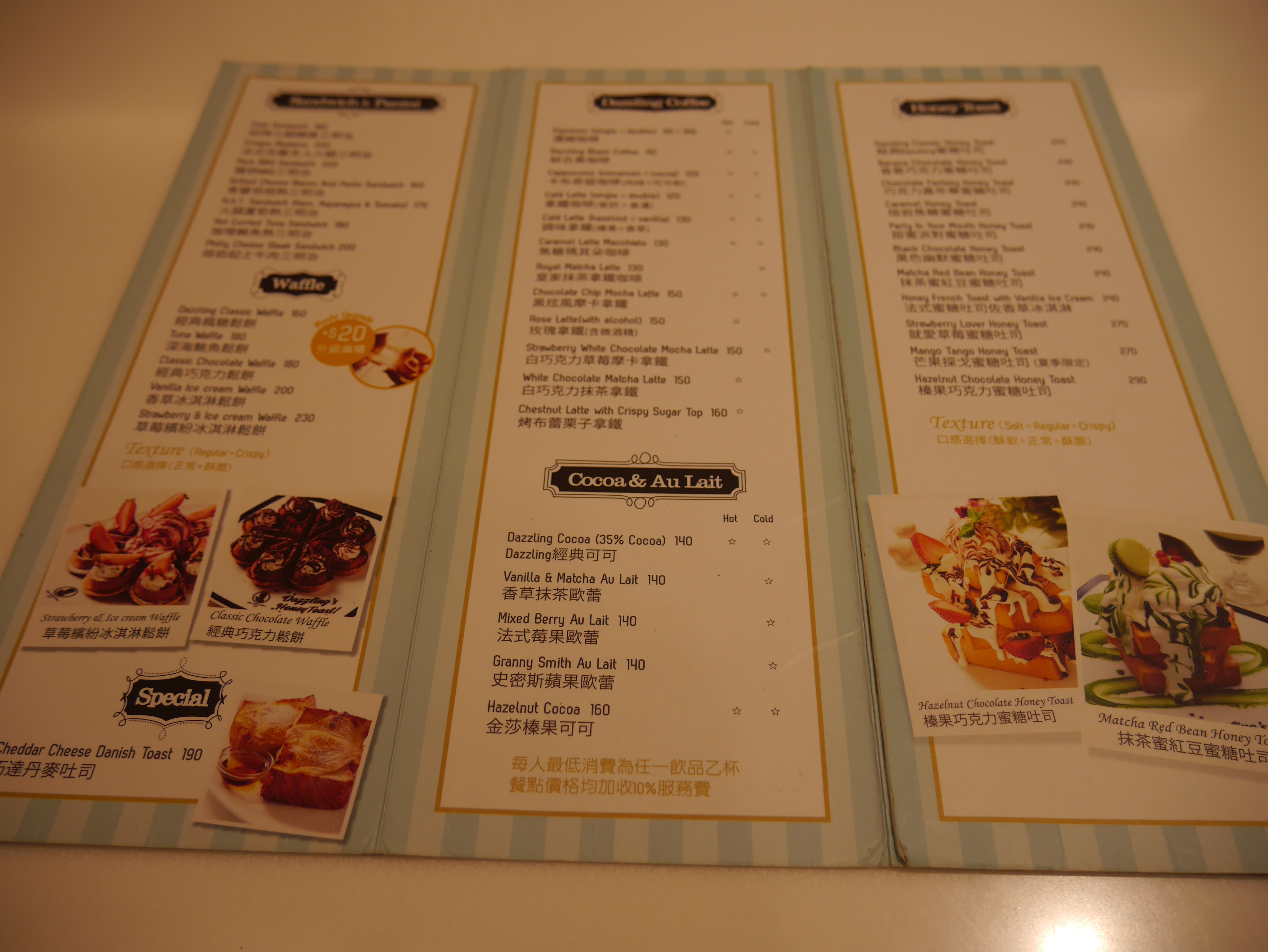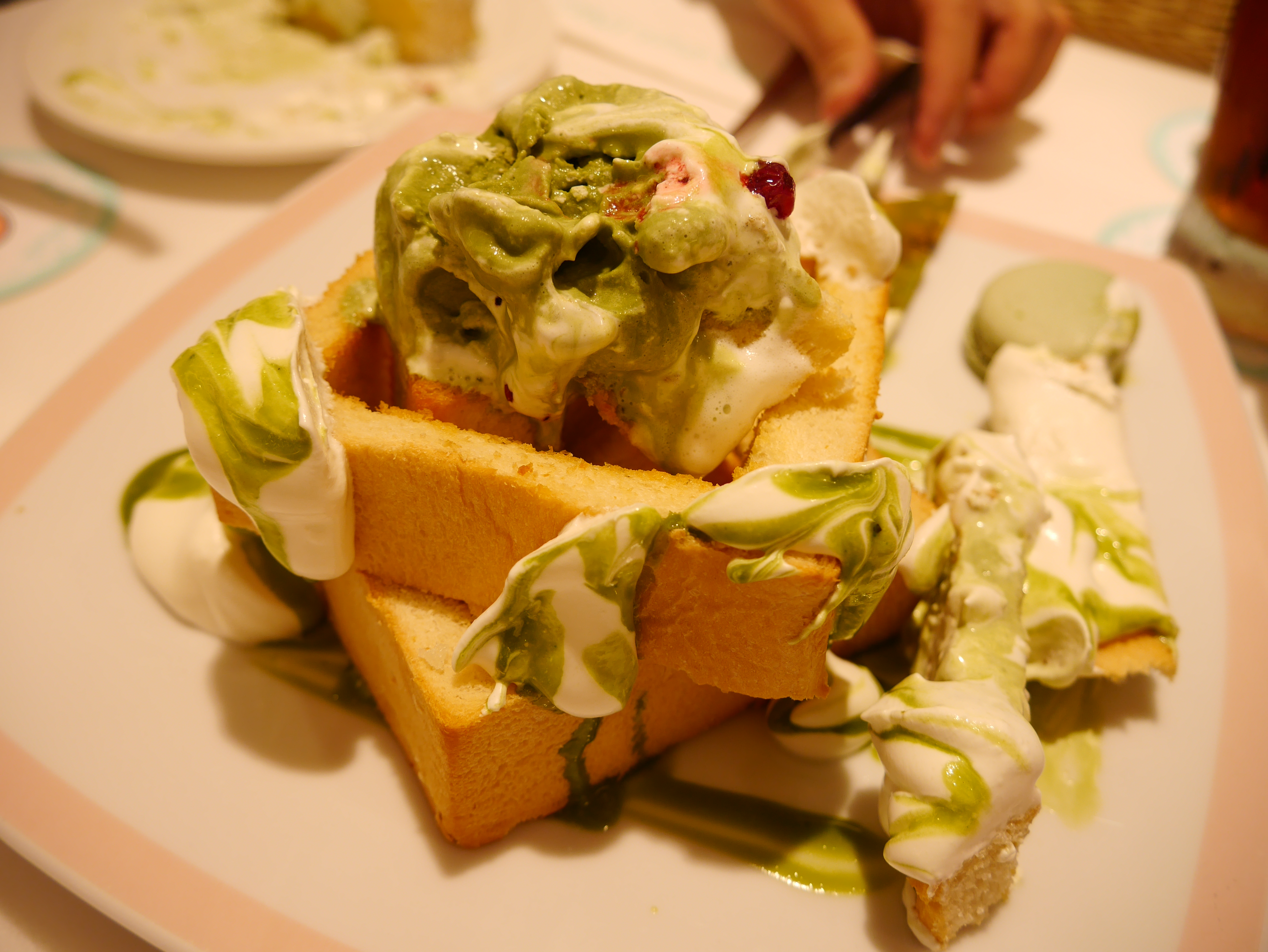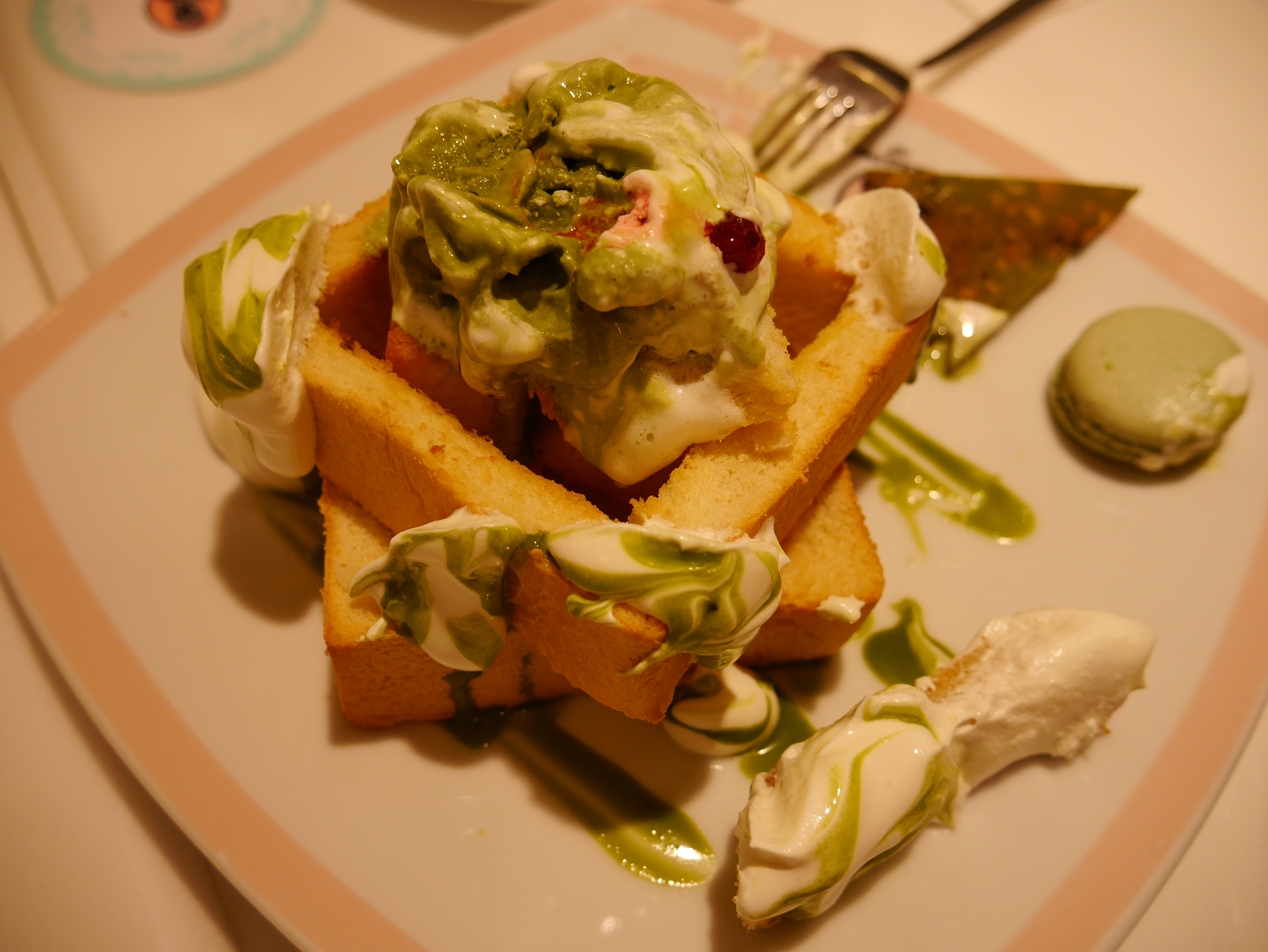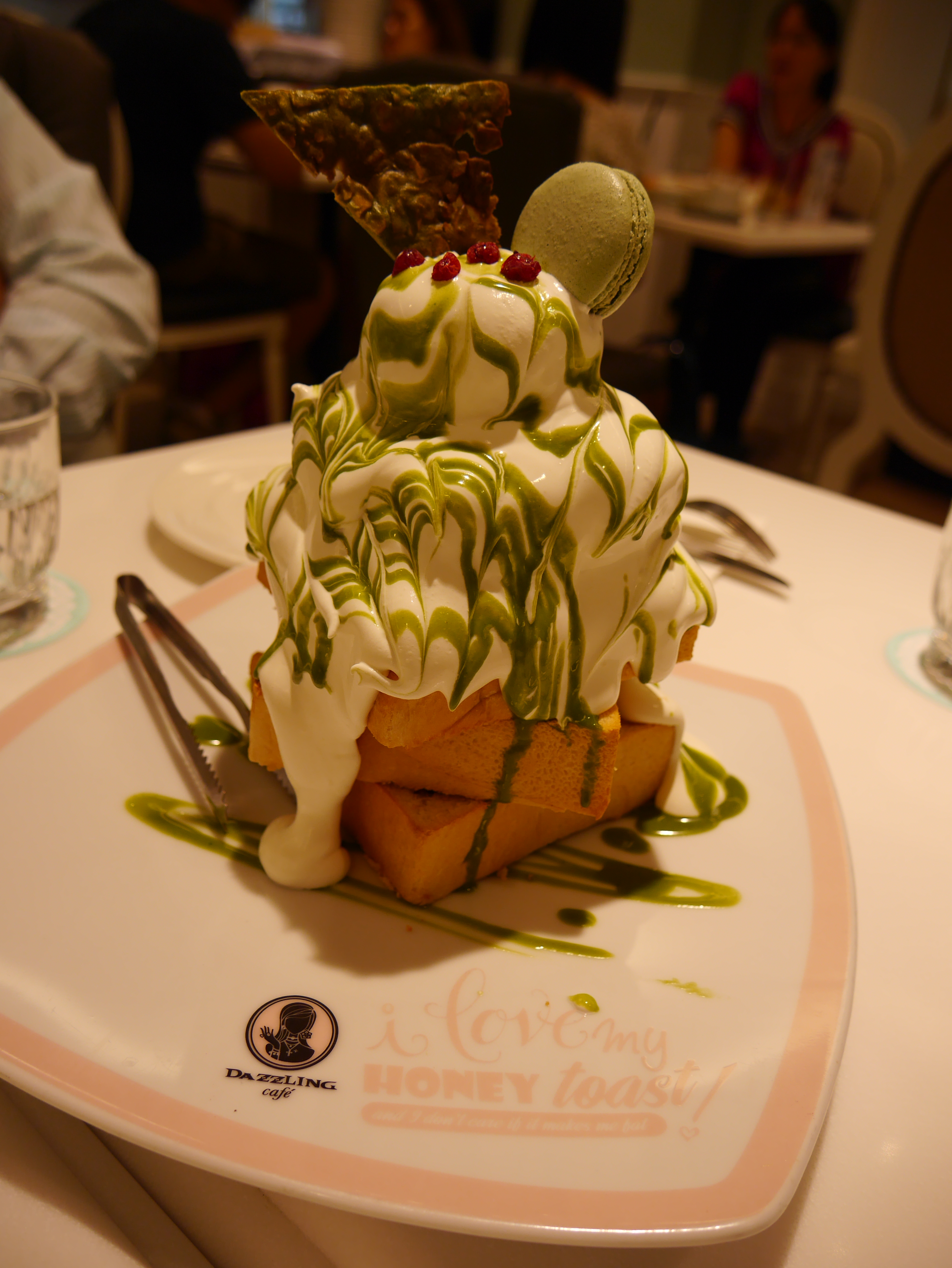 Dragging our 20kg luggage through subway stations and streetwalks of Taipei seemed like the best way to work up an appetite. So that day, a native Taiwanese friend, Wesley, met us at the legendary Dazzling Cafe, touted by many food bloggers for their famous ice-cream toasts. And we feasted on this ginormous 3-tiered toast splendidly flavoured with matcha ice-cream and whipped cream! The place was really rather pretty! It’s no wonder their main store and 2 other franchises are really popular hangouts for Sunday brunch and weekday tea-breaks. You actually had to take queue numbers to get seats at the place. Or if you would rather not wait, making reservations in advance would be a good idea.