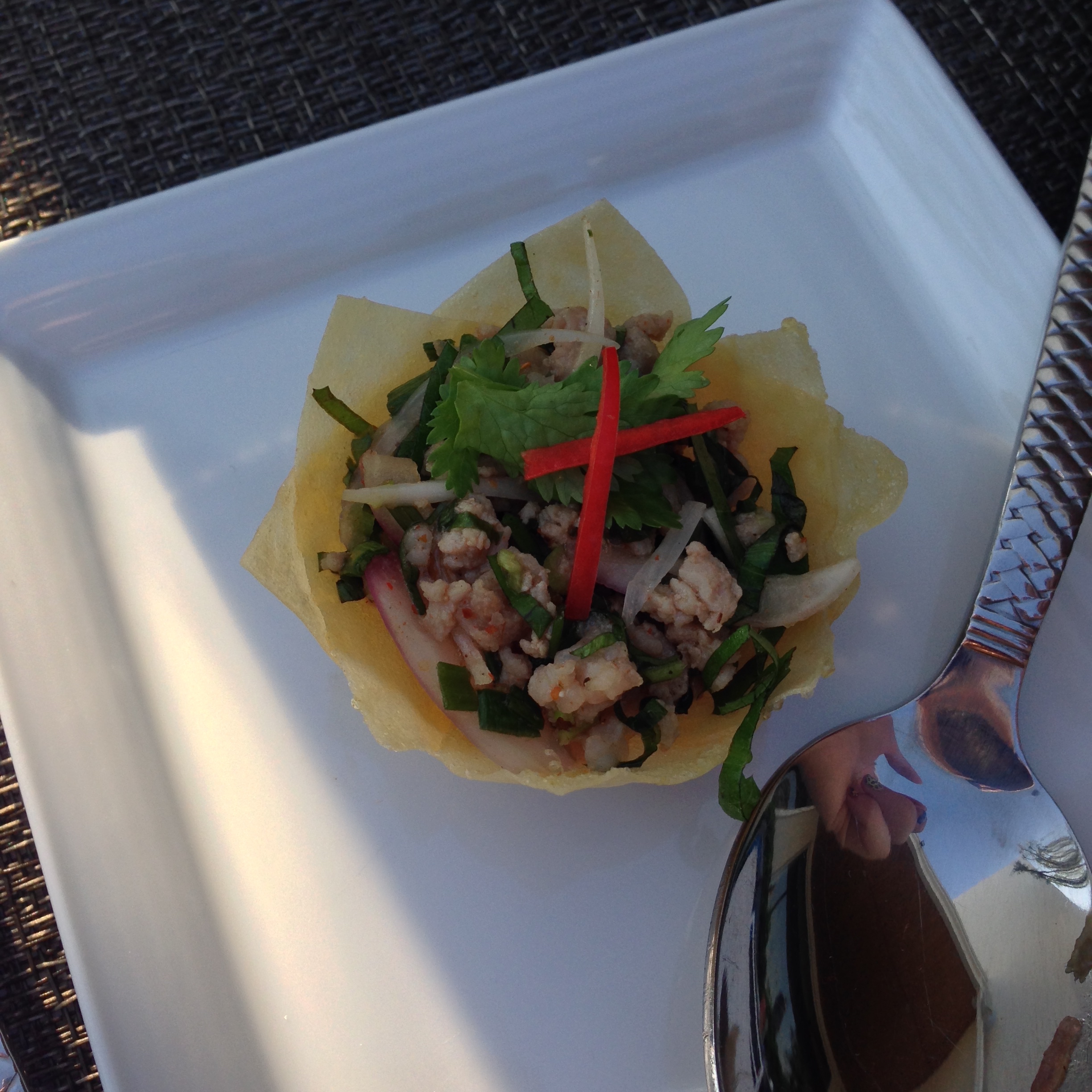 Coffee and canapés. In Thailand sauce maketh a meal complete.